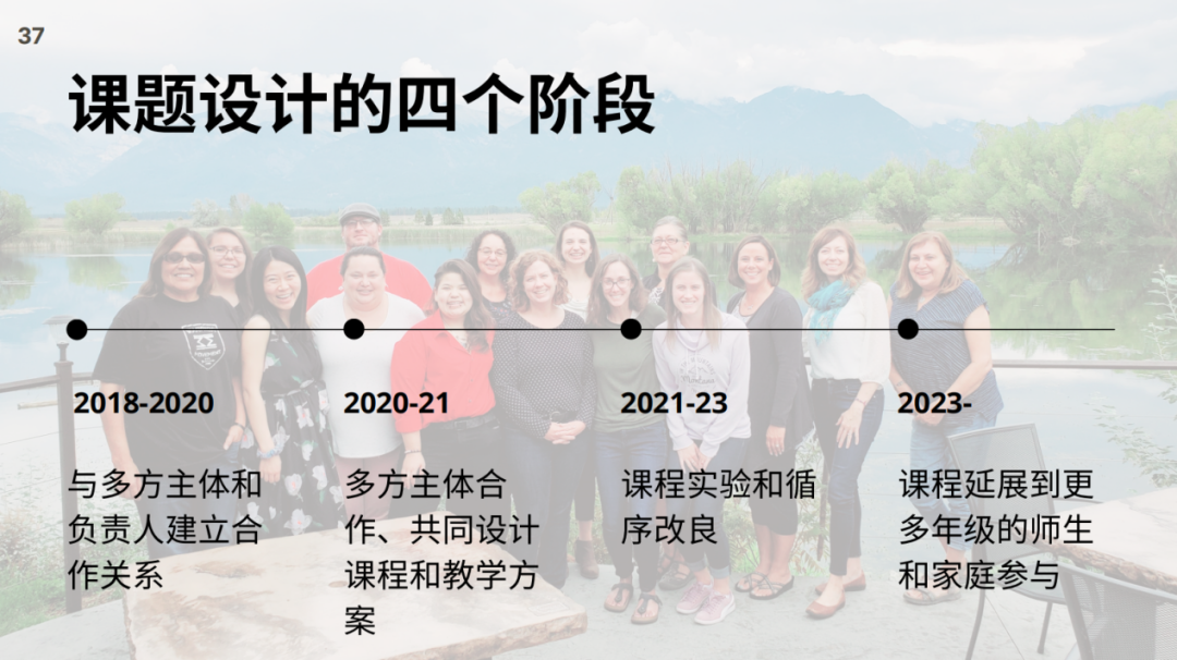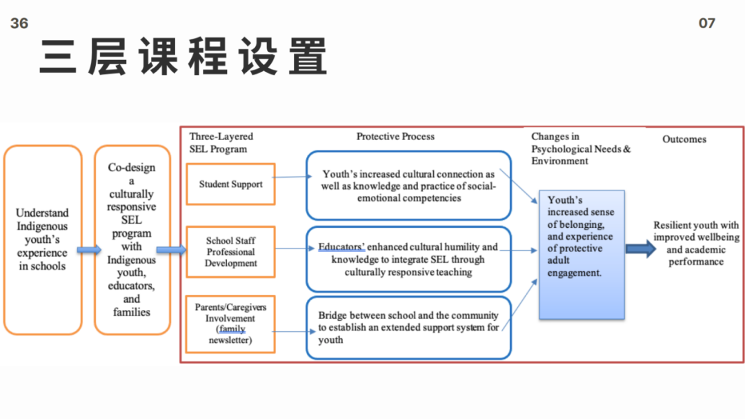 In the curriculum setting for Native American children, she paid attention to the two cultural factors of aboriginal people and mainstream culture, and carried out a three-tiered curriculum design, dividing the curriculum design into four stages. Through the long-term cooperation from 2018 to 2023 and with the improvement of curriculum experiments, the localization of curriculum design has been gradually realized. This kind of curriculum design not only aims at the development of social emotional strength, but also helps Aboriginal students understand their own culture and enhance cultural confidence.