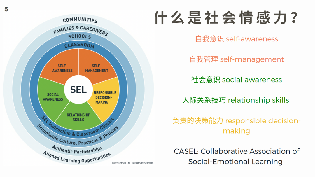 First, she introduces the concept of social-emotional learning. At the individual level, social-emotional learning broadly includes self-awareness, self-management, social awareness, relationship skills, and responsible decision-making. In addition to these five aspects, factors such as classroom, school education, parents, and the community will also have an impact on the development of children's social-emotional learning.