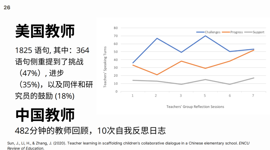 Collaborative discussion can help promote children's social-emotional development, so how can teachers design instruction to introduce collaborative discussion in school settings? Associate Professor Sun Jingjing then introduced her second topic - assisting teachers to introduce collaborative discussion into Chinese and American classroom teaching. The research question she specifically focuses on is: What are the challenges and gains that teachers encounter when they try to collaborate and discuss? Can reflective teacher discussions help teachers build confidence and effectively incorporate collaborative discussion into classroom instruction? Through the comparative experiment between China and the United States, she obtained the following experimental results.