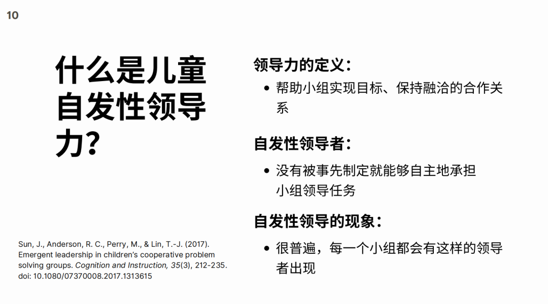 Associate Professor Sun Jingjing's research mainly focuses on the use and transfer of children's spontaneous leadership in collaborative discussions, and its help to group cooperation. Her experimental subjects included 252 Chinese fifth-grade students. The students were divided into an experimental group and a control group. Students in the experimental group were asked to discuss some social issues through collaborative discussions, while the control group did not undergo such pre-training. Then, the students in the experimental group and the control group had to conduct a collaborative discussion on three math problems. The experiment mainly focused on the performance of children's spontaneous leadership from four aspects, including assigning tasks, proposing and explaining solutions, planning group time, and promoting group consensus. Through experiments, she found that participating in collaborative discussions can enable children to use more effective leadership and reduce ineffective leadership, and the effect of leadership is not affected by students' usual speech performance.