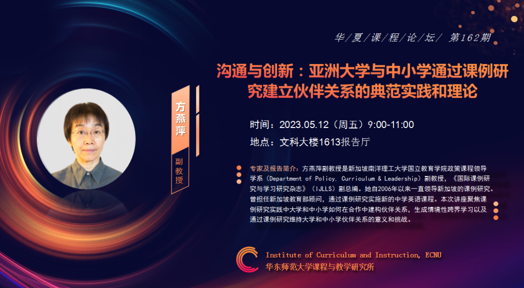 On the morning of May 12, Associate Professor Fang Yanping, Department of Policy Curriculum Leadership, National Institute of Education, Nanyang Technological University, Singapore, guested at the 162nd session of the Huaxia Curriculum Forum, and made a speech entitled "Communication and Innovation: Classical Practices and theories of Partnerships between Asian Universities and Primary and Secondary Schools Established Through Lesson Studies".The forum was chaired by Professor An Guiqing from the Institute of Curriculum and Instruction, East China Normal University, and attracted many teachers and students to participate in the study and discussion.