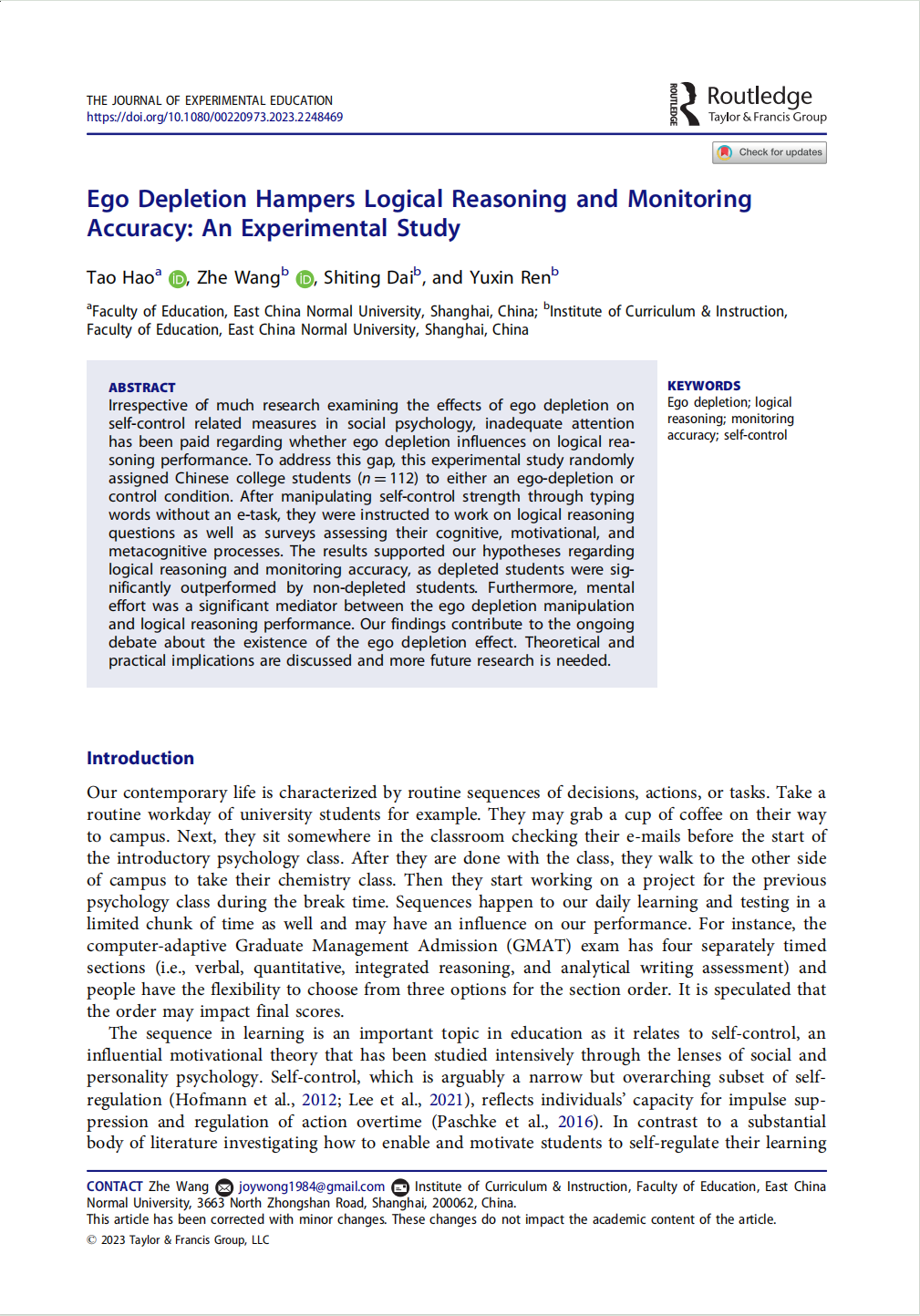 Results supported our hypotheses regarding logical reasoning and monitoring accuracy (as reflected by correlations between performance and self-judgment), as ego-depleted students performed significantly worse than non-ego-depleted students.