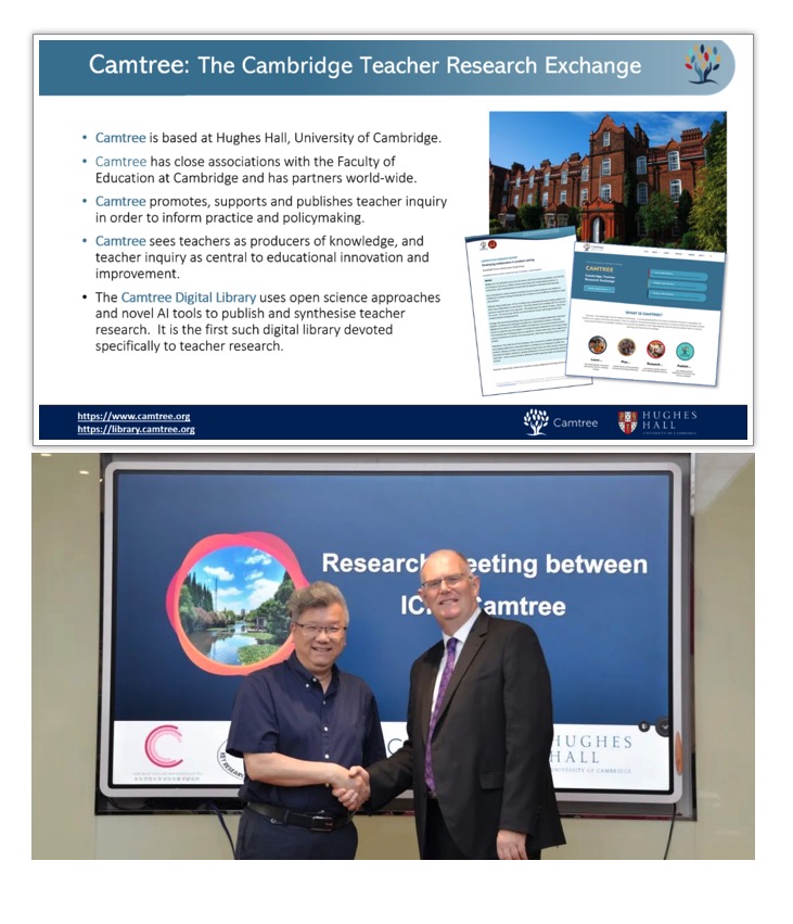 During the offline visit on May 27, Professor Cui Yunhuo, Director of the ICI, warmly welcomed the two experts. He fully affirmed the advancement, leadership and professionalism of the Cambridge University Teacher Research Exchange Center (Camtree) in developing systematic teacher training materials and supporting teachers' independent research. He pointed out that Camtree already has relatively mature experience in many aspects, which is closely aligned with the research and practice of the ICI. He hopes to strengthen cooperation with Camtree in the future, learn from each other's useful experience, give full play to research synergy, and jointly promote the professional development of primary and secondary school teachers in our country.