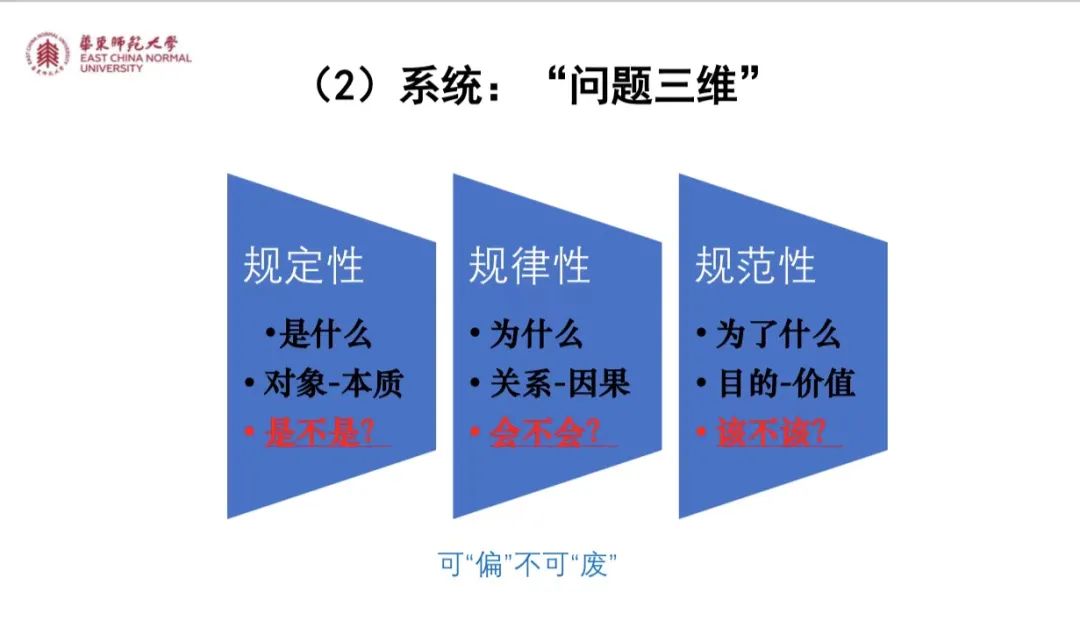 In the "Problem Awareness" section, Professor Yang discussed the "problem triangle" and "problem three-dimensionality" of the paper in detail, and arranged seven common problem misunderstandings. "Problem triangle" refers to "Problem-Question-Issue". "Problem three-dimensionality" refers to the "what-regularity, why-regularity, and for what-normativity" dimensions of the problem. Through the construction of frameworks and matrices, tools are provided for listeners to identify and understand "problem awareness".