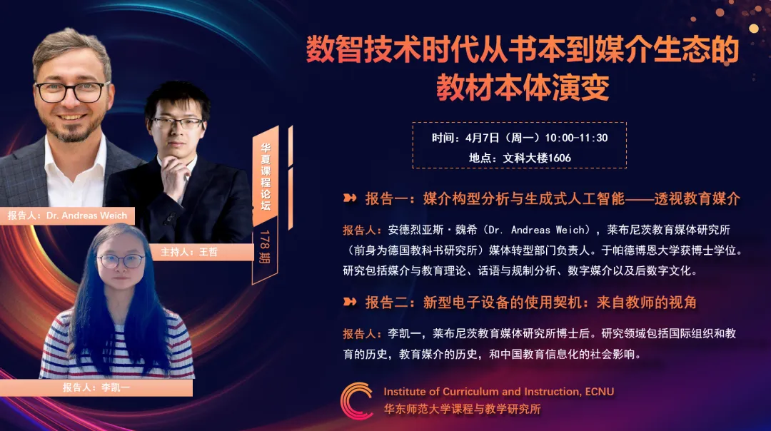 On April 7, the Institute of Curriculum and Instruction of East China Normal University successfully held the 178th Huaxia Curriculum Forum with the theme of "The Evolution of Textbook Ontology from Books to Media Ecology in the Digital Intelligence Era". The forum was hosted by Associate Professor Wang Zhe, and invited Dr. Andreas Weich and Dr. Li Kaiyi from the Leibniz Institute for Educational Media (formerly the German Textbooks Institute) to conduct in-depth discussions from the perspectives of media research and educational practice respectively. The forum attracted many educational scholars, teachers and researchers to participate in the discussion of the transformation and future of textbook ontology in the era of digital intelligence technology.