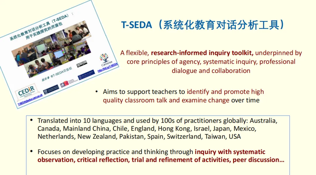 T-SEDA is a flexible, research-informed inquiry toolkit. Based on the core principles of teacher agency, systematic inquiry, professional dialogue and cooperation, the toolkit can help teachers identify and promote high-quality classroom dialogues and study changes through critical reflection, experimentation, trial and improvement activities. Currently, T-SEDA has been translated into multiple languages and is widely used in global educational practices.