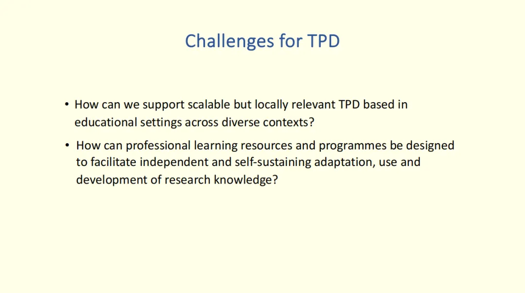 How can we support scalable but locally relevant TPD based in educational settings across diverse contexts? How can professional learning resources and programmes be designed to facilitate independent and self-sustaining adaptation, use and development of research knowledge? Starting from the two major challenges faced by teacher professional development, Professor Hennessy introduced the Toolkit for Systematic Educational Dialogue Analysis (T-SEDA) to assist teachers in conducting practical inquiry.