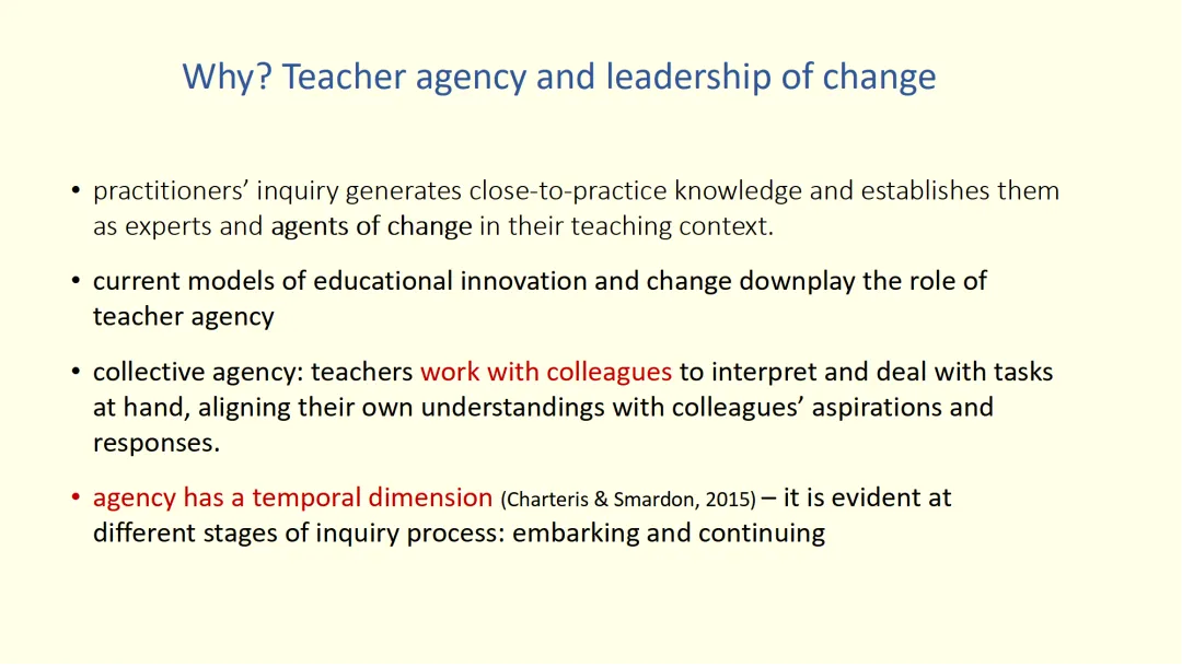 Teacher-led inquiry encourages teachers to give full play to their initiative, explain their professional knowledge in new ways, reflect on their own practical experience, and conduct collaborative inquiry with the support of leaders, so as to achieve continuous teacher professional development and improve students' learning effects. Teacher-led inquiry can better apply academic research results to localized teaching context and also make teachers themselves experts and change promoters.